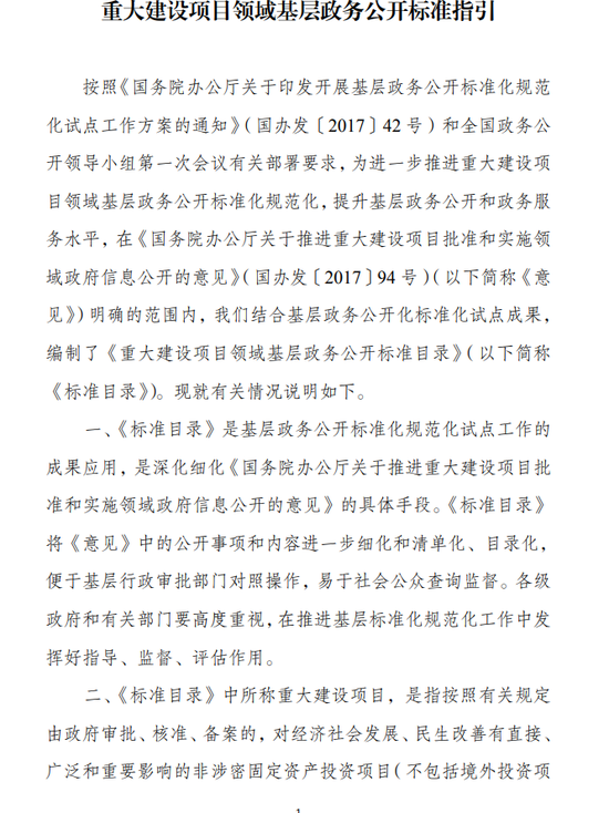 为进一步推进重大建设项目领域基层政务公开标准化规范化,提升基层政务公开和政务服务水平,按照国办信息公开办要求,我们编制了《重大建设项目领域基层政务公开标准指引》。现印发给你们,请参照执行。