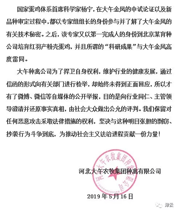 早些时候,孙大午在其微博上发表并置顶了一篇名为《首席科学家杨宁学术不端,剽窃民企科研成果,真的没人敢管吗?》的文章,将矛头直接指向了中国农业大学教授、世界家禽学会主席、国家蛋鸡产业技术体系首席科学家、中国工程院院士候选人杨宁。称其“剽窃”蛋鸡品种大午金凤的育种技术,并用“剽窃”来的技术谋利。