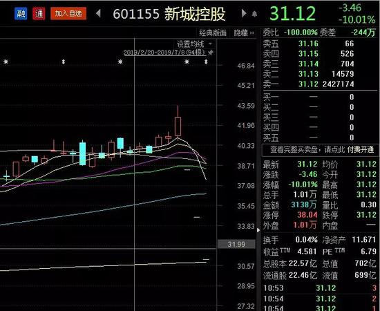 早盘,新城控股开盘时继续跌停,股票价格报31.12元/股,封单数超过240万手。