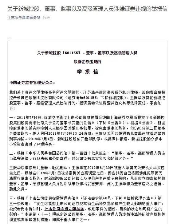 7月7日,上海、江苏两名律师向中国证监会实名举报,直指新城控股、董事、监事以及高级管理人员涉嫌证券违规。