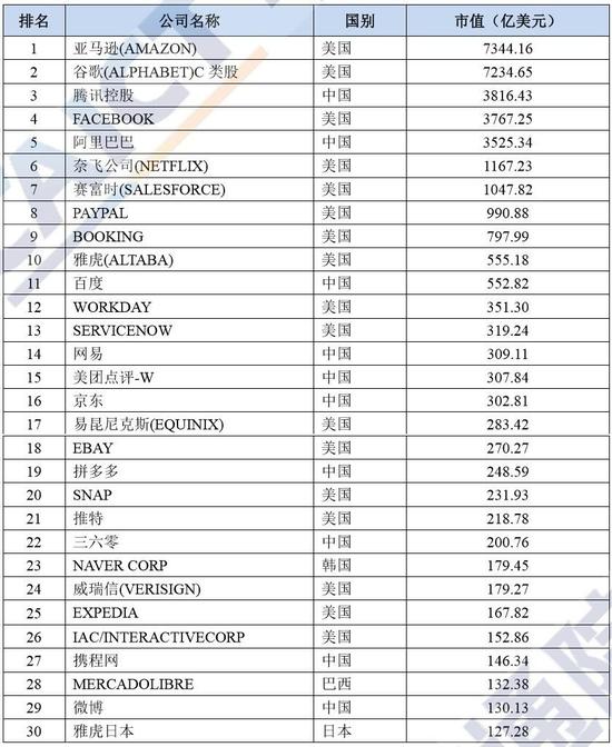 DoNews 7月13日消息(记者 赵晋杰)根据中国信息通信研究院发布的2019《中国互联网行业发展态势暨景气指数报告》(以下简称报告),其中列出了最新的全球上市互联网30强榜单,截至2018年底,中国上榜企业达到10家,较2017年增加1家。
