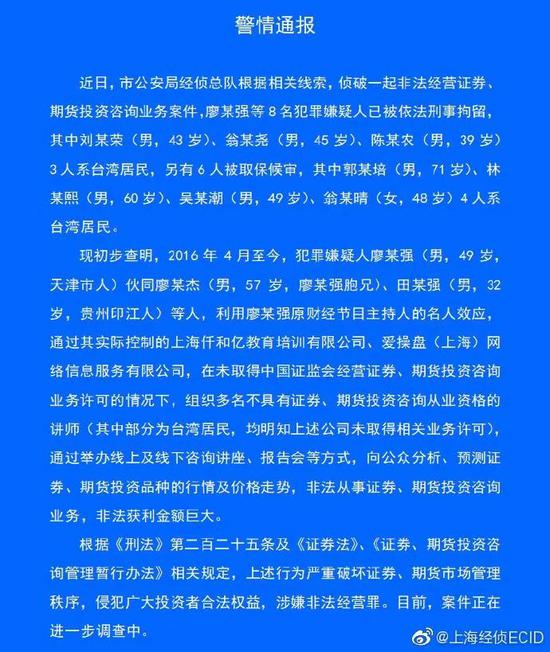 初步查明,2016年4月至今,犯罪嫌疑人廖某强(男,49岁,天津市人)伙同廖某杰(男,57岁,廖某强胞兄)、田某强(男,32岁,贵州印江人)等人,利用廖某强原财经节目主持人的名人效应,通过其实际控制的上海仟和亿教育培训有限公司、爱操盘(上海)网络信息服务有限公司,在未取得中国证监会经营证券、期货投资咨询业务许可的情况下,组织多名不具有证券、期货投资咨询从业资格的讲师(其中部分为台湾居民,均明知上述公司未取得相关业务许可),通过举办线上及线下咨询讲座、报告会等方式,向公众分析、预测证券、期货投资品种的行情及价格走势,非法从事证券、期货投资咨询业务,非法获利金额巨大。