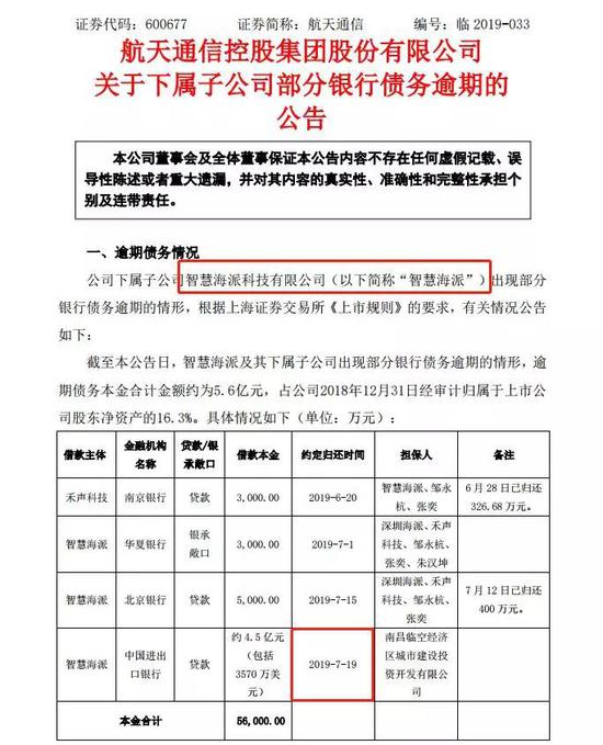 7月23日晚间,航天通信发布《关于下属子公司部分银行债务逾期的公告》,根据公司公告,公司下属子公司智慧海派科技有限公司(以下简称“智慧海派”)出现部分银行债务逾期的情形,逾期债务本金合计金额约为5.6亿元,占公司2018年度经审计归属于上市公司股东净资产的16.3%。
