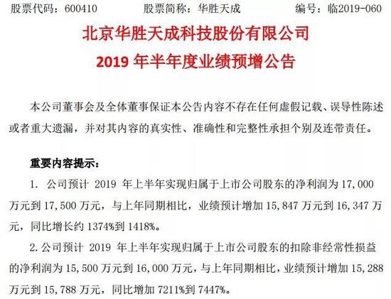7月24日,华胜天成发布上半年业绩预告,预计2019年1-6月实现的净利润为1.7亿元到1.75亿元,同比增长1374%到1418%。