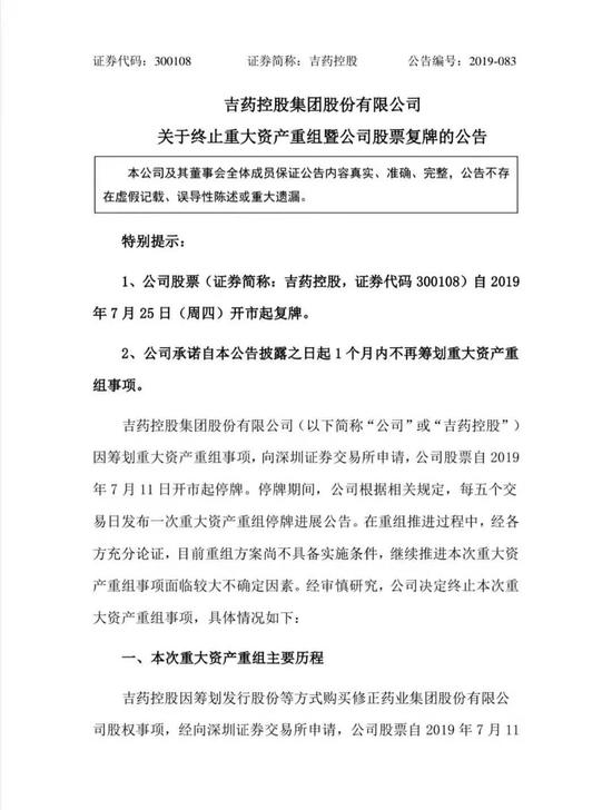 这一切随着7月24日晚吉药控股发布的终止重大资产重组公告按下了终止键。