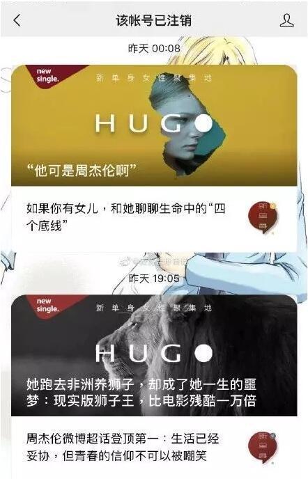 7月22日晚,拥有500多万粉丝的公众号“HUGO”显示自主注销。目前该公众号已无法被搜索到,发送消息时显示:“该公众号已自主注销,你可取消关注”。