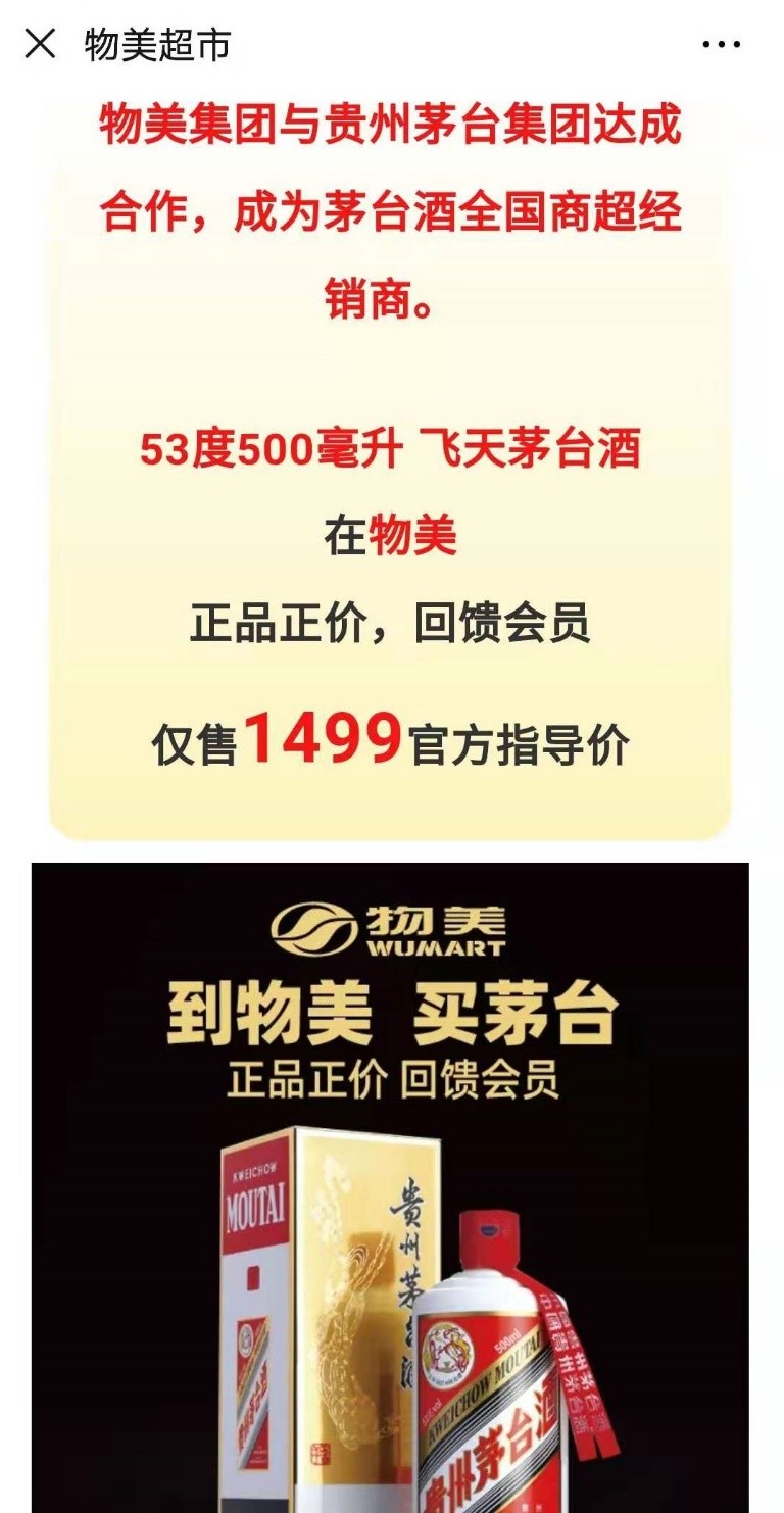 7月30日,物美超市官方微信公众号发布了《到物美买茅台,53度飞天茅台1499元》的文章,称物美集团与茅台集团达成合作,成为茅台酒全国商超经销商,“正品正价”,8月3日开始预售,“仅售1499官方指导价”。