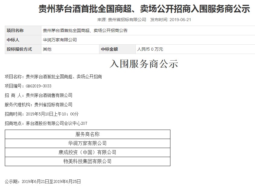 根据贵州省招标投标公共服务平台6月21日公布的公示信息,首批入围的全国商超、卖场为华润万家、康成投资(大润发)、物美集团;首批入围的贵州本地商超、卖场为贵阳星力百货集团有限公司、贵州华联综合超市有限公司、贵州合力购物有限责任公司。