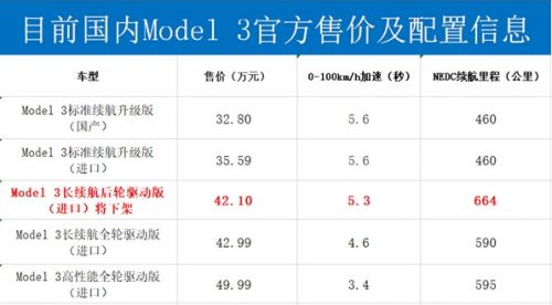 下架后Model 3将剩下三个版本,分别为标准续航后驱升级版(NEDC 460km)、长续航全轮驱动版(NEDC 590km)以及Performance高性能全轮驱动版(NEDC 595km)。