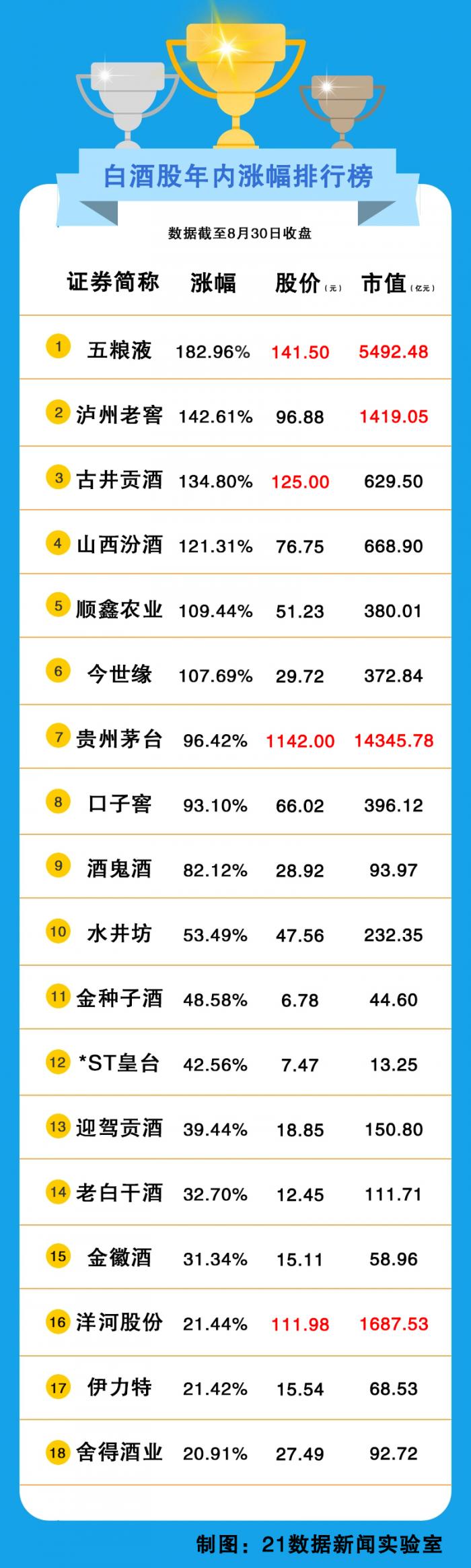 板块内个股实现了全线上涨,其中6只个股股价翻番,分别为五粮液、泸州老窖、古井贡酒、山西汾酒、顺鑫农业(51.230, -0.17, -0.33%)、今世缘。行业龙头股贵州茅台紧随其后,涨幅已达94.42%。即便是板块内涨势最弱的个股舍得酒业(27.490, 0.59, 2.19%),涨幅也已达到20.91%,跑赢同期上证指数涨幅。