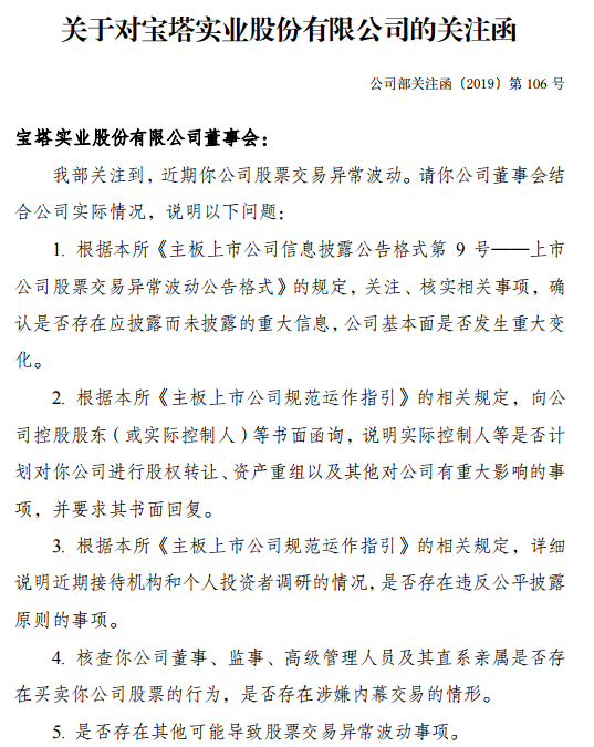 9月3日深夜,宝塔实业(4.830, 0.44, 10.02%)收到深交所下发的关注函,要求公司说明三项事宜: