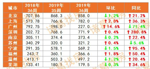 报告显示,第36周,监测10城市的新房库存面积小幅上升0.6%,分城市来看,库存上升的城市个数与下降的个数参差分半,北京、南京、宁波、温州、芜湖库存面积小幅降低;上海、广州、深圳、苏州、福州库存面积上升,其中,广州库存面积上升较为明显,环比上升14.6%。