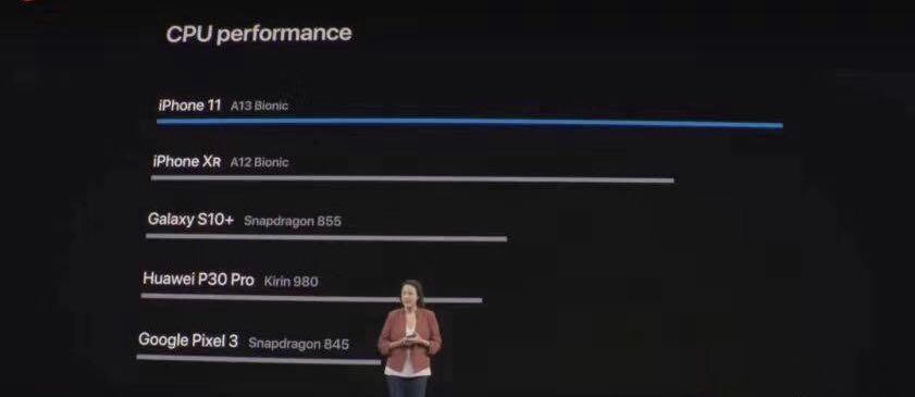 苹果在发布会上展示了对比图,称A13仿生芯片GPU和CPU(中央处理器和图形处理器)表现远超众多安卓竞争对手,图中列出的竞对包括三星、华为和谷歌。据称这是苹果首次将华为列出进行对比。