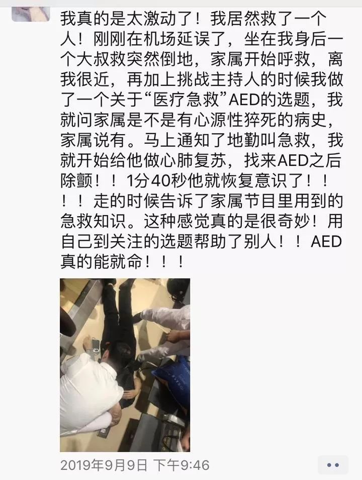 幸好急救及时,经第一时间心肺复苏和AED除颤,过了1分40秒左右,原先没了脉搏的大伯慢慢有了意识。