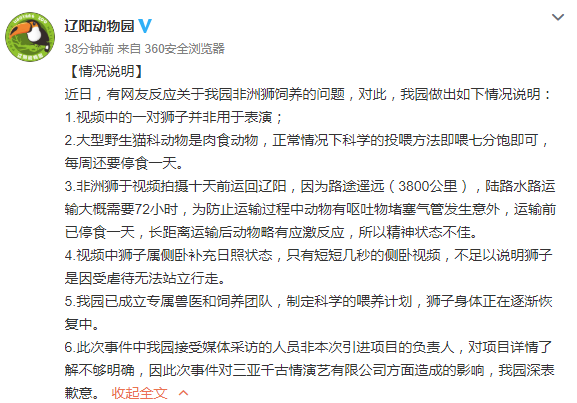新京报快讯 辽阳动物园16日在官博就非洲狮饲养问题作出情况说明,称网传视频的一对狮子并非用于表演,视频也不足以说明狮子是因受虐待而无法站立行走。