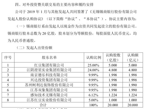(二)同意红豆集团及其关联方红豆股份认购锡商银行总股本30%股份的发起人资格,其中红豆集团占25%,红豆股份占5%。同意江阴澄星实业集团有限公司认购锡商银行总股本24%股份的发起人资格。