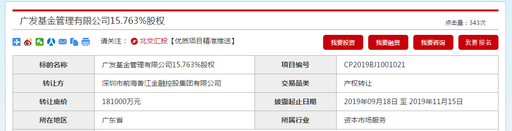 从公告的相关信息来看,此次挂牌的15.76%的广发基金股权,转让方为前海香江,其共持有广发基金15.76%的股权,也就是说,此次是属于全部一次性转让。