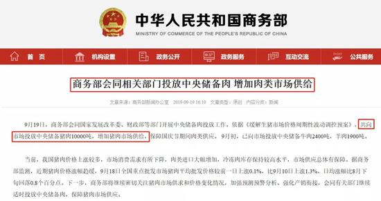 9月19日,商务部会同国家发展改革委、财政部等部门开展中央储备肉投放工作。