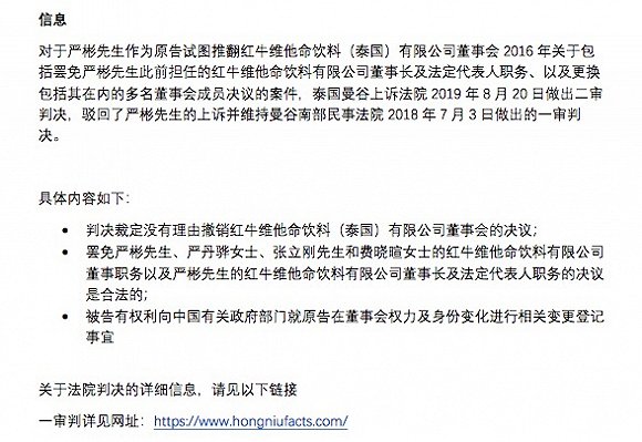 该网站9月公布的一份董事会上诉信息显示,对于严彬作为原告试图推翻红牛维他命饮料(泰国)有限公司董事会2016年关于包括罢免其此前担任的红牛维他命饮料有限公司董事长及法定代表人职务、以及更换包括其在内的多名董事会成员决议的案件,泰国曼谷上诉法院2019年8月20日做出二审判决,驳回了严彬的上诉、并维持曼谷南部民事法院2018年7月3日做出的一审判决。
