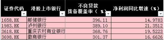 在港股上市的银行中,有4家的拨备覆盖率也超过了300%。4家银行分别是邮储银行(016558.HK)、泸州银行(3.14, 0.00, 0.00%)(01983.HK)、重庆农商行(03618.HK)和徽商银行(2.8, -0.03,-1.06%)(03698.HK),拨备覆盖率分别达到了396.11%、389.10%、368.76%和301.37%。