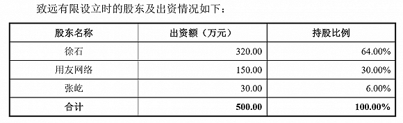 致远互联成立于2002年4月2日,法定代表人徐石,注册资本5773.9583万元。设立时是由徐石、用友网络和张屹共同出资完成,当时的用友网络以150万元出资额拥有公司30%股权。