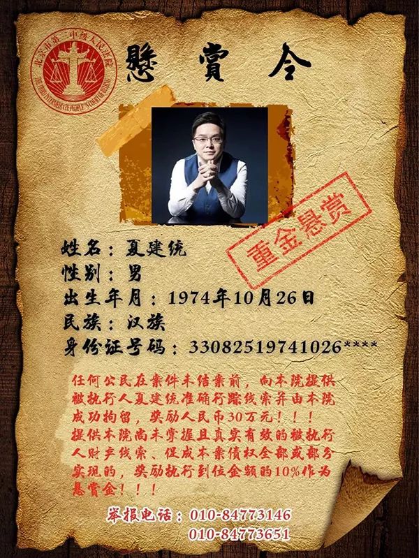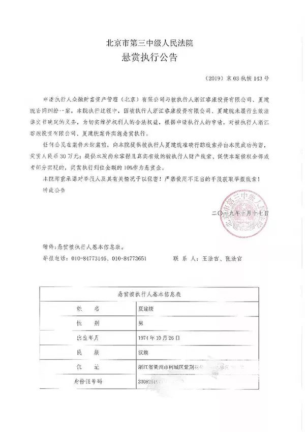 北京市第三中级人民法院10月17日发布悬赏执行公告:因在执行过程中被执行人浙江睿康投资有限公司、夏建统未履行生效法律文书确定的义务,根据申请执行人的申请,对被执行人睿康投资公司、夏建统实施悬赏执行。