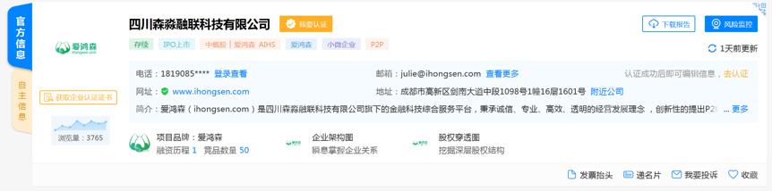 爱鸿森是四川森淼融联科技有限公司旗下的互联网金融平台,于2014年5月正式上线运营。天眼查显示,森淼融联科技有限公司地址为成都市高新区剑南大道中段。