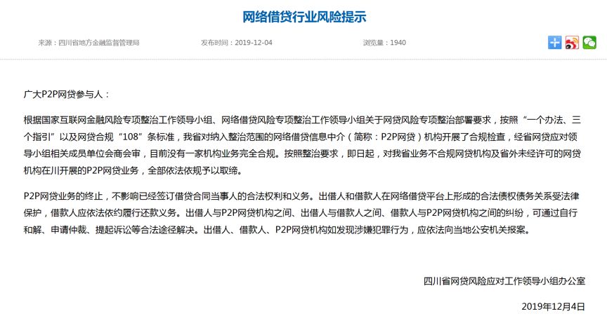 四川省网贷风险应对工作领导小组办公室4日发布风险提示称,四川省对纳入整治范围的网络借贷信息中介(P2P网贷)机构开展了合规检查,经省网贷应对领导小组相关成员单位会商会审,目前没有一家机构业务完全合规。即日起,对四川省业务不合规网贷机构及省外未经许可的网贷机构在川开展的P2P网贷业务,全部依法依规予以取缔。