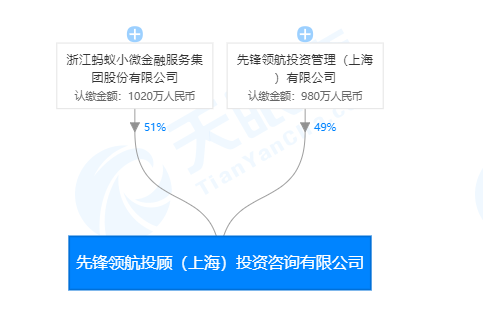 天眼查数据显示,6月5日,浙江蚂蚁小微金融服务集团股份有限公司新增对外投资,成立先锋领航投顾(上海)投资咨询有限公司,注册资本2000万元人民币。