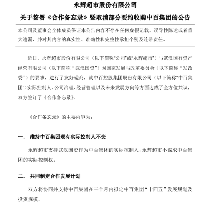 根据此次公告,因国家发改委要求,永辉超市与武汉国有资产经营有限公司(简称“武汉国资”)达成共识,签订《合作备忘录》,涉及中百集团的实际控制人、公司治理、经营管理以及未来发展方向等方面。