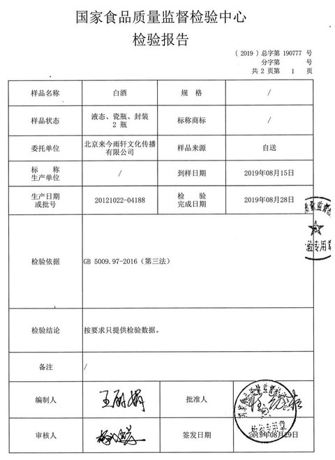 12月21日,来今雨轩相关负责人石磊向上证报记者表示,今年8月,其委托国家食品质量监督检验中心对酒鬼酒相关品次产品进行检验时,同时还向湖南省长沙市公证处申请公证。