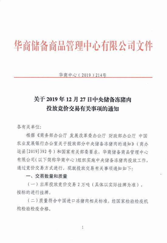 新京报讯(记者 王思炀)12月25日,华储网发布中央储备冻猪肉投放竞价交易有关事项的通知。华商储备商品管理中心有限公司将于12月27日实施中央储备冻猪肉投放2万吨竞价交易。届时,12月投放到市场的中央储备肉将上升到14万吨。