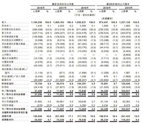受益于“太二”酸菜鱼的崛起,九毛九近年来的业绩增长突飞猛进,营业总收入从2016年的11.64亿元增至2018年的约18.93亿元,复合年增长率为27.5%;公司经调整纯利也在今年上半年首次突破亿元大关,达到1.16亿元。