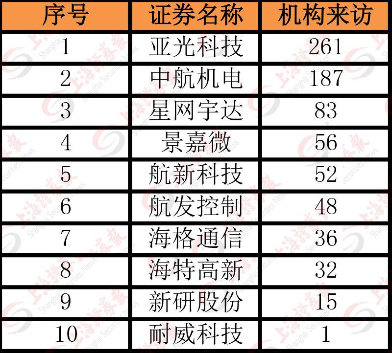 e公司讯,近期军工企业成为机构调研的焦点之一。记者观察到,军工芯片、低轨卫星、航空成为最受机构关注的三个领域。据东方财富(20.170,0.85, 4.40%)Choice数据显示,节后以来,10家军工企业接受机构调研高达771次。其中,亚光科技(14.480, 0.94, 6.94%)最受关注,迎来了261家次机构的调研;排在第二的为中航机电(7.990, -0.07, -0.87%),迎来了187家次机构的调研;此外,星宇网达、景嘉微(65.040, -1.14, -1.72%)、航新科技(17.040, 0.32, 1.91%)三家公司也都迎来50家次以上的机构调研。