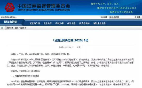 时任创业慧康(24.000, 0.04, 0.17%)法律顾问于昕,在内幕信息敏感期内控制新开立信用账户于相关敏感时点集中资金大量买入公司股票且于公告后两个交易日全部卖出获利。浙江证监局决定没收于昕违法所得344.29万元,并处以1032.86万元罚款。