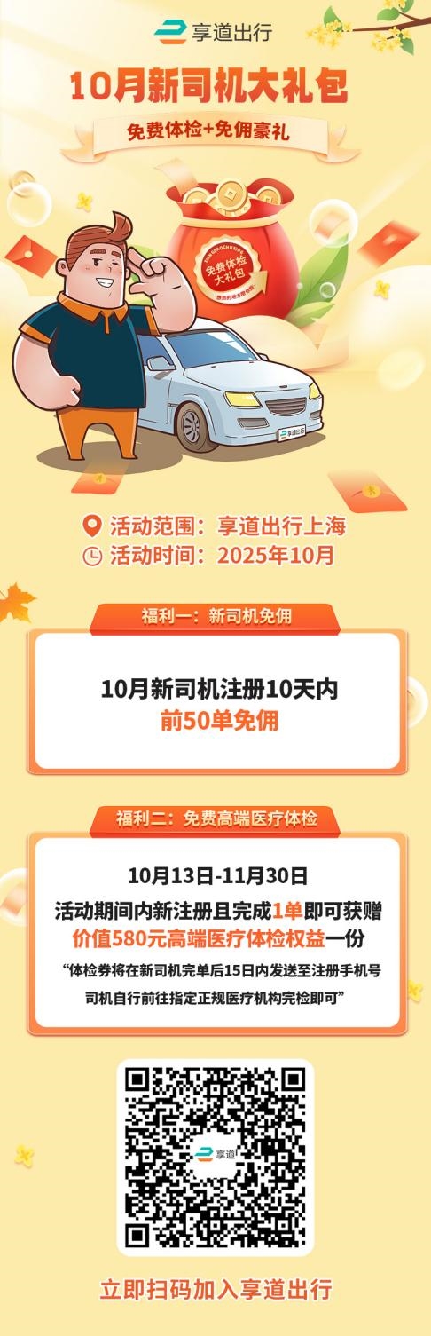 上汽集团移动出行战略品牌享道出行在全国多个城市启动司机招募专属奖励政策。在上海,享道出行启动十月专属新司机补贴奖励——“免费体检+免佣豪礼”,10月新加入享道出行的司机朋友可享受注册10天内前50单免佣,另有完单即享价值580元的高端体检一份,让司机朋友们跑得安心、赚得开心。