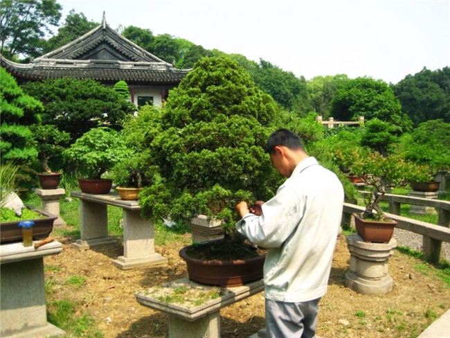 走进万景山庄,仿佛踏入一座立体的画屏。这里是苏派盆景的集大成之地,汇聚了数百盆精品,其中不乏树龄超过600岁的“清奇古怪”柏树组合盆景。而此刻,最吸引人的并非静止的展品,而是动态的“春忙”图景。