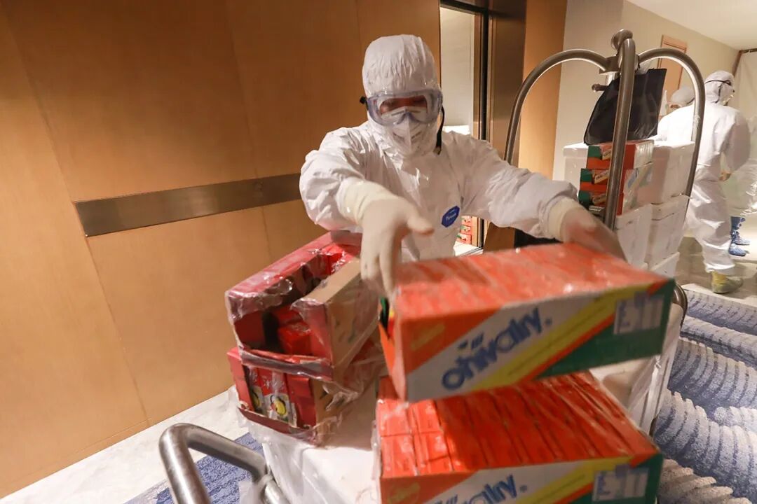 “6楼xx房需要赶紧送快递过去!”接到“前台”的指令后,来自联明保安公司的“快递小哥”张亚辉立马行动起来,他推着满满一推车的快递上了电梯,优先为“催单”的隔离人员送上了快递。